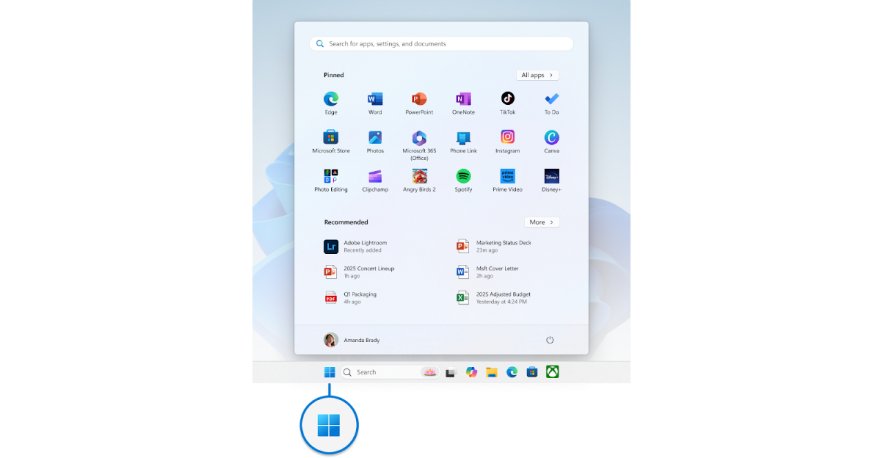 Now that you have the Start menu open, you’ll see different sections: Search, Pins, Recommendations, and Account.