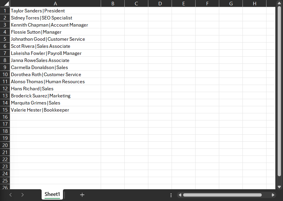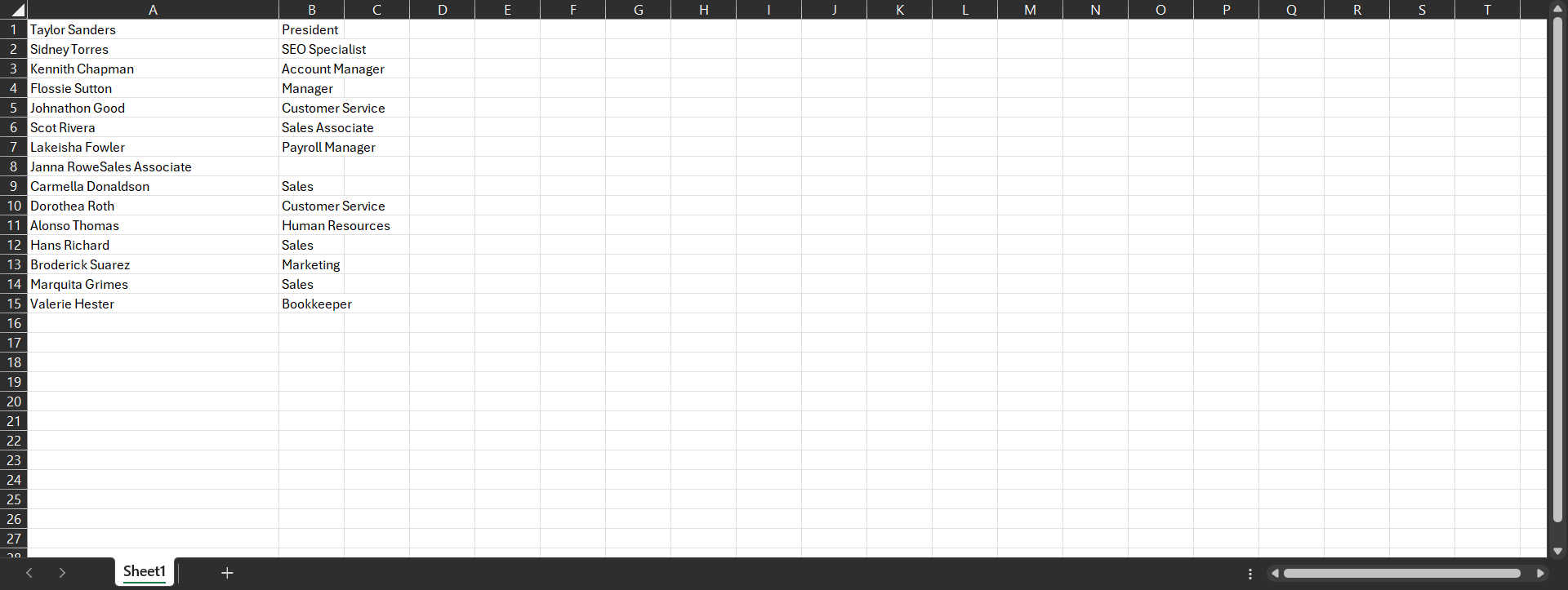 Let’s say there’s a small business comprising 15 people collaborating to serve its client base. In an Excel document, these team members are listed, along with their job titles, as follows:
