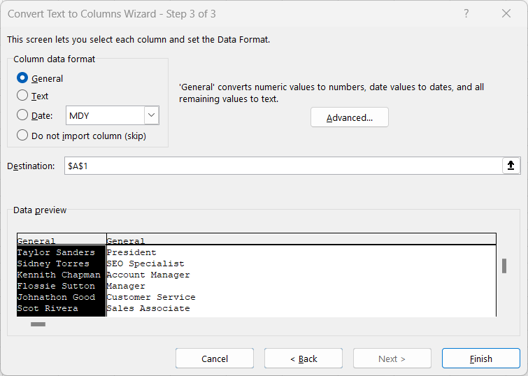 If needed, you can identify what kind of data each column will hold so Excel will format it correctly.