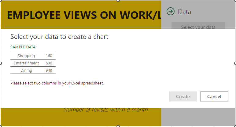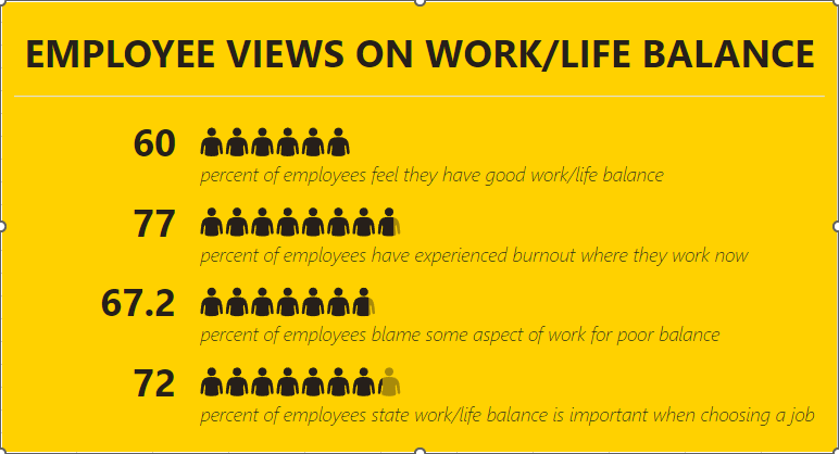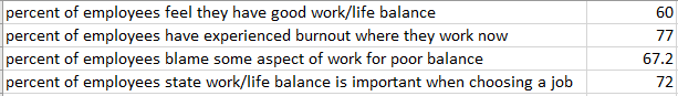 The first thing you need to make a People Graph is the spreadsheet from which it will pull its data. For example, let's say you wanted to share some statistics about the work/life balance of today’s workforce. You might list out the statistics in one column, then include the actual numeric values for those statistics in another column.